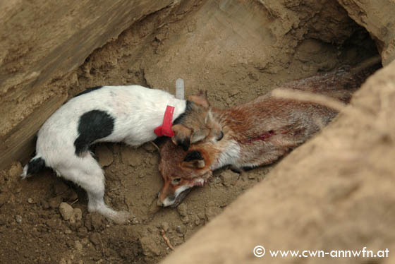 Guest cwn annwfn Posted July 3, 2006 Report Share Posted July 3, 2006 This pic shows our white dog (4 years now) and our young bitch (white/black, now 1,5 years old), both in their orange protection jackets, together with another PRT bitch at a wild boar hunt last winter. The wild boar was already shot when the pic was taken;) That´s our 5 year old bitch pulling out a vixen (already shot) of the end of the pipe after digging with an excavator, Hope it works. We don´t have so many pics since there is either no time or not enough light... but we´ll try again next season;) Quote Link to post Share on other sites
