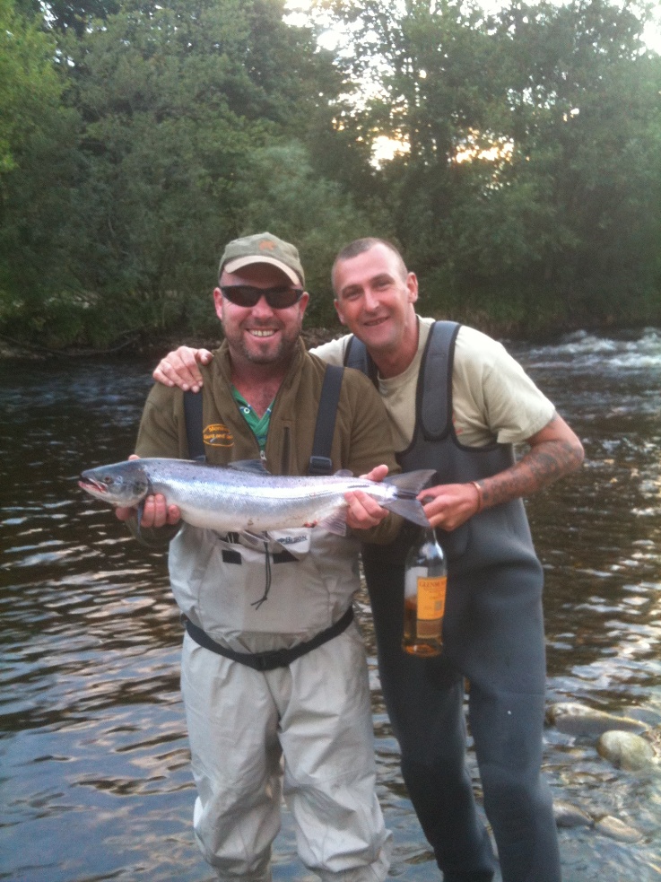 MOO 730 Posted August 19, 2010 Report Share Posted August 19, 2010 got up at 3 in the morning yesterday to catch first light for our last date on our syndicate water ....There were plenty of fish showing right through the junction pool as daylight came in but with bright sunshine ,low water and the air pressure dropping conditions were not ideal but the early bird gets the worm and you need to be in it to win it as they say ...I covered fish but they were not taking then at 07;30 I got a 3lb grilse on a small tube took a quick pic and was returned to carry on its journey ...fished through till the afternoon helped by a bottle of whisky then went and walked and fed the hounds ....came back at 5 and no one had caught anything ...so it was time to change tactics and another few bottles of whisky between the group I put a big muddler mouse fly one made from shaped deers hair and stripped it across the pool 3rd cast and I lost a double figure fish that tail walked right across the pool but snapped the wee treble on the tail of the flee .....5 mins later lost another fish .....then another 5 mins later with everyone watching as they could believe I was getting strikes with this fly I hooked and landed a nice 6lb grilse that gave a very good account for itself in the fast water and the 10' rod Quote Link to post