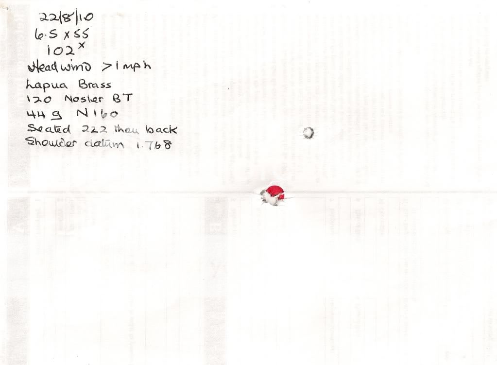 dicehorn 38 Posted August 22, 2010 Report Share Posted August 22, 2010 Having played about with neck tension on 20 rounds of 6.5 x 55 which were on their 11th firing and with hardly a breeze this morning set a target out at around my zeroed range of 100 yds having done my usual cleaning of the bore. After three shots and whilst taking the fourth shot, what I thought was a fly landed at the side of my mouth and just as I was squeezing the trigger and at the point of no return this fly - a horse fly decided to change my POI by biting me. After recovering managed to put a further two more in to complete a 5 shot group. When I walked to the target the 10mm red bull at 12 oclock was in fact bent back. Anyway excluding the horse fly's attempt this gave a 5 shot group of .287 http://i438.photobucket.com/albums/qq101/wyndog/65x55102yds-1.jpg For those that may be interested - after full sizing, I then ran a bushing from my neck sizing die to cover a 1/4 of the neck surface to bring me back more or less to my custom loads. Quote Link to post