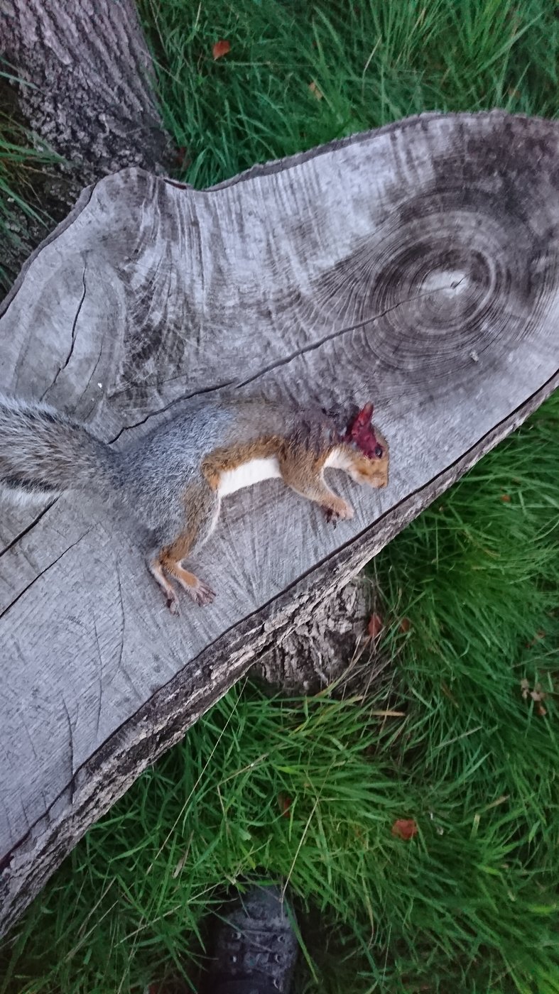 Well decided on the last couple of hours before dark on the perm, see what was about, did,nt even see a rabbit, was sat in a corner against the fence,L my back to the small wood, the only shots I got was one for a zero test at 35yds, then this squirrel at just under 35yds sat on a fence post eating an acorn..