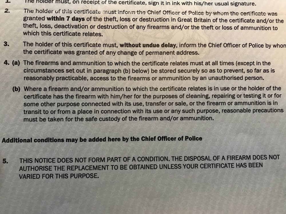 villaman 9,982 Posted December 17, 2018 Author Report Share Posted December 17, 2018 14 minutes ago, walshie said: I have those, pretty much word for word. Do you have a condition 5 relating to the gun itself? I have, and others relating to different guns and uses. No , I have no condition 5 . I believe FAC air you don't need land to be cleared , Police forces around the country are a bit different and FAO even in the same county say different whether fac air land should or should not be cleared , they seem not to sing from the same hymn sheet 1 Quote Link to post