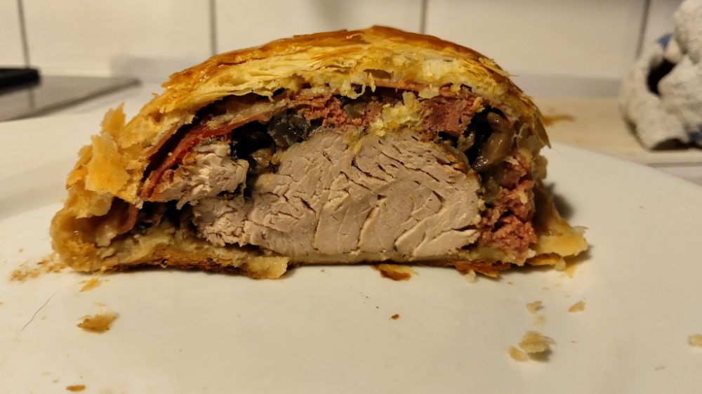 dytkos 17,993 Posted 8 hours ago Report Share Posted 8 hours ago Pork fillet wrapped with prosciutto, Brussels Pâté, sauteed mushrooms and onions in a puff pastry case. All made myself except the pastry Cheers, D. Quote Link to post Share on other sites