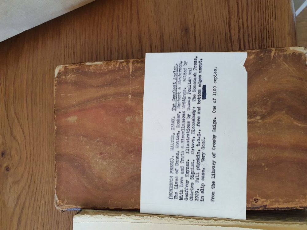 Ken's Deputy 4,463 Posted April 26, 2021 Report Share Posted April 26, 2021 Shame about the condition. But, all the same: 1929 The Compleat Angler Limited Ed Nonesuch Press Geoffrey Keynes Signed WWW.EBAY.CO.UK Limited edition, number 248 of 1100 copies. The Nonesuch Press : London. The Compleat Angler The Lives of Donne, Wotton, Hooker, Herbert... Quote Link to post Share on other sites