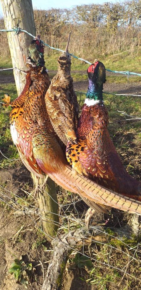 I had a couple of hours walkabout this afternoon to try for a final pheasant. I started off straight away bagging a brace of cocks and on going to pick them a woodcock sprung and I took that too , great start.