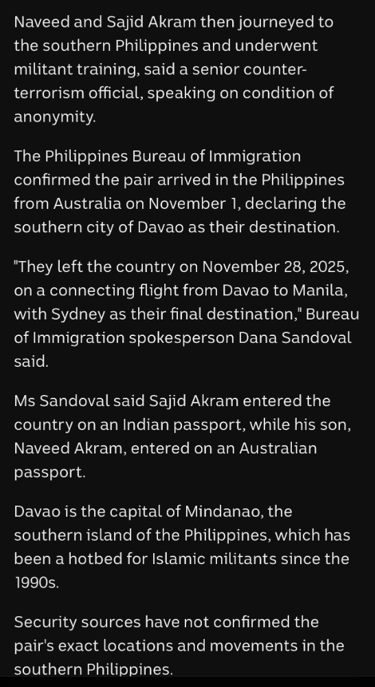 mackem 30,939 Posted December 16 Report Share Posted December 16 8 minutes ago, lurcherman 887 said: Indians pretending to be Pakistanis ? that’s happened before. Or a Pakistani pretending to be Indian?Philippines gave Indians visa free travel earlier in the year so just fly in. A number of terrorist training camps were formed in the southern islands (Mindanao and sulu archipelago) due to drone strikes on camps in the Afghan/Pakistan khyber region. 1 Quote Link to post Share on other sites