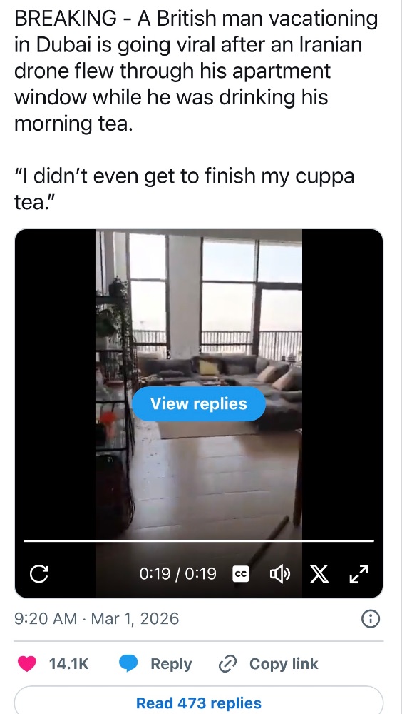 mackem 31,782 Posted March 2 Report Share Posted March 2 This bloke is a legend,he sounds understandably a little shaken at the drone strike but stiff upper lip as he never got to finish his cup of tea. Quote Link to post Share on other sites