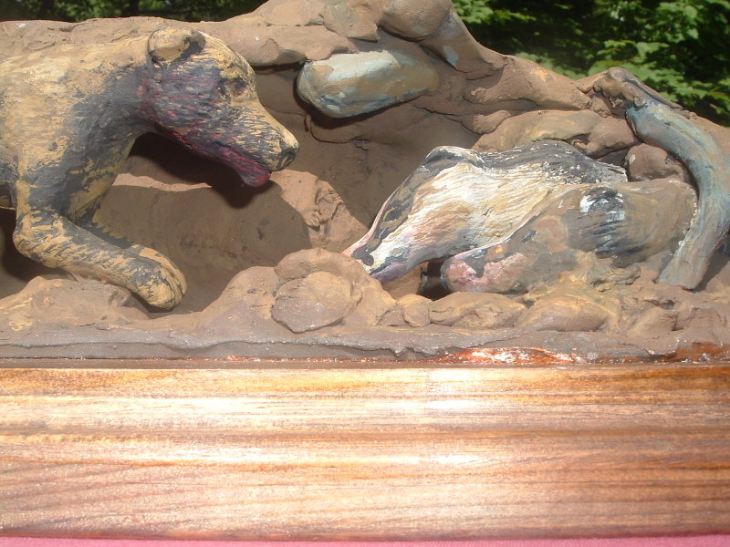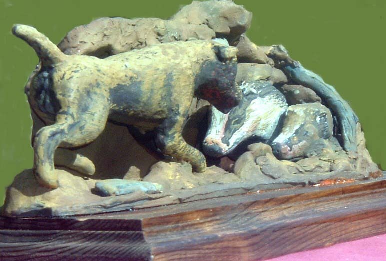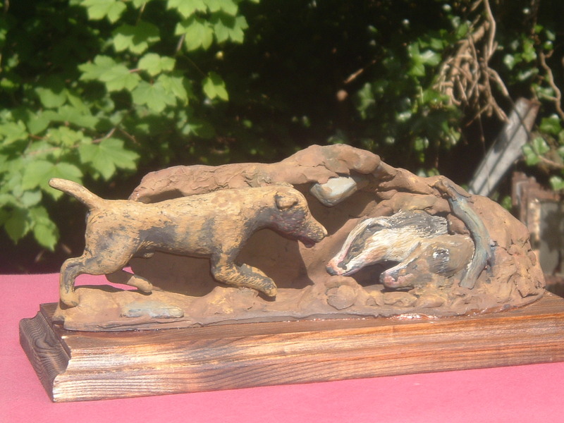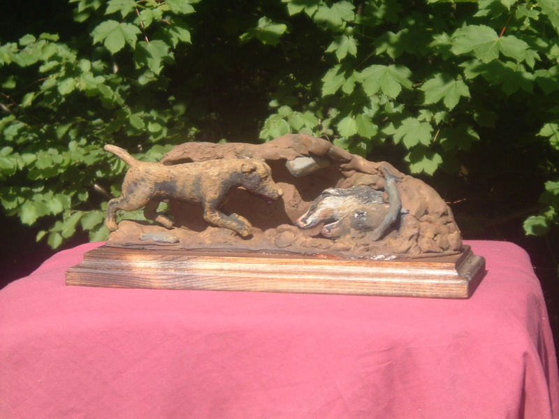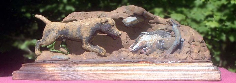 This sculpture depicts a black Patterdale Terrier holding at bay two European Badgers.